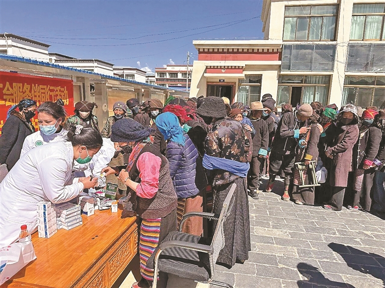 浪卡子縣人民醫(yī)院工作人員向多卻村婦女群眾發(fā)放藥品。記者 巴桑旺姆 攝
