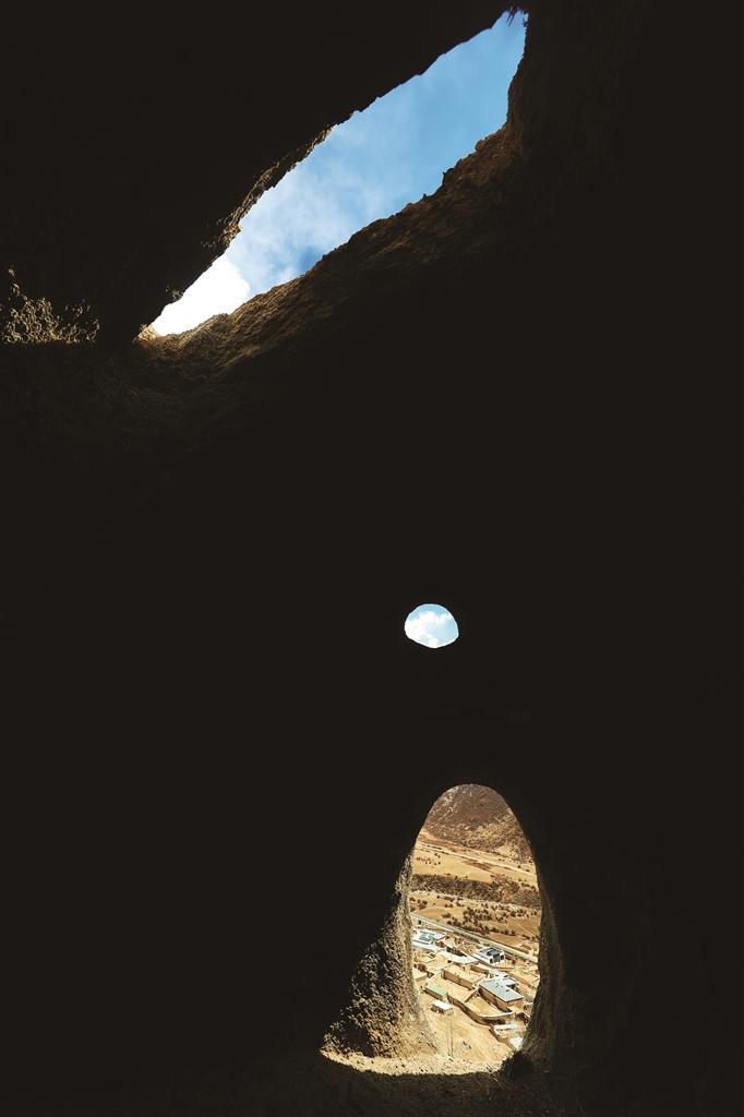 恰日多山洞位于拉薩市墨竹工卡縣門巴鄉(xiāng)仁多崗村恰日多自然組北約50米處的囊扎日山半山腰,洞口坐西朝東、門向正東。洞口呈階梯狀層次,步入洞內(nèi)向外眺望,三孔景致錯(cuò)落有致:最上方為不規(guī)則巖頂開(kāi)口,澄澈藍(lán)天與流云傾瀉而入,明暗對(duì)比鮮明;中間是圓形小窗,宛如嵌在巖壁上的“天空之眼”,框住漫天云絮;最下方為拱形門洞,向外望去,河谷間土黃色藏式民居錯(cuò)落排布,與高原草甸、連綿遠(yuǎn)山相融,盡顯藏地鄉(xiāng)村的質(zhì)樸遼闊。