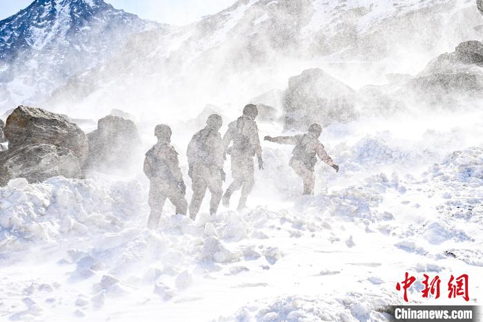 標(biāo)沙拉錯哨點官兵艱難行走在風(fēng)雪中?!⒅镜?攝