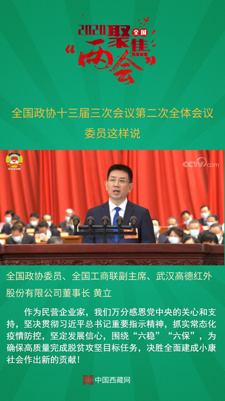全國政協(xié)委員、全國工商聯(lián)副主席、武漢高德紅外股份有限公司董事長黃立發(fā)言說,作為民營企業(yè)家,我們?nèi)f分感恩黨中央的關(guān)心和支持,堅決貫徹習(xí)近平總書記重要指示精神,抓實常態(tài)化疫情防控,堅定發(fā)展信心,圍繞“六穩(wěn)”“六?!?,為確保高質(zhì)量完成脫貧攻堅目標(biāo)任務(wù),決勝全面建成小康社會作出新的貢獻(xiàn)!