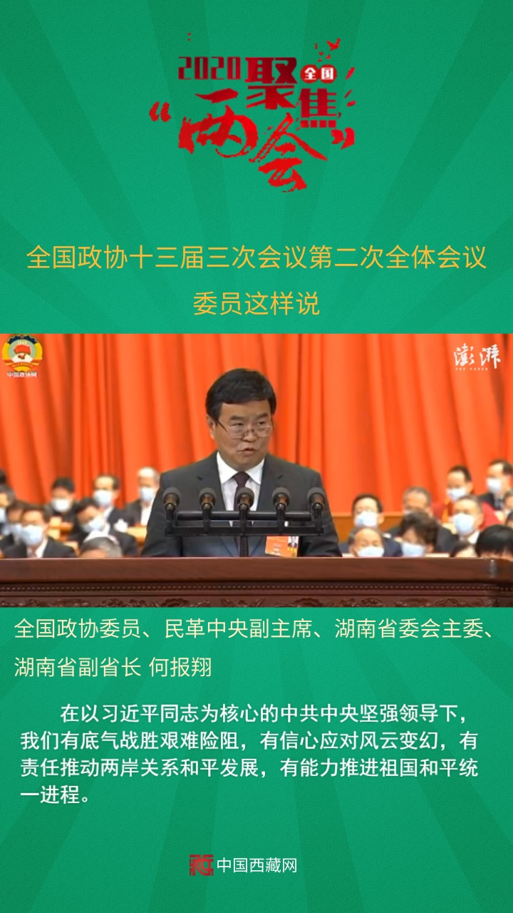 全國政協(xié)委員、民革中央副主席、湖南省委會主委、湖南省副省長何報翔發(fā)言說,在以習(xí)近平同志為核心的中共中央堅強領(lǐng)導(dǎo)下,我們有底氣戰(zhàn)勝艱難險阻,有信心應(yīng)對風(fēng)云變幻,有責(zé)任推動兩岸關(guān)系和平發(fā)展,有能力推進(jìn)祖國和平統(tǒng)一進(jìn)程。