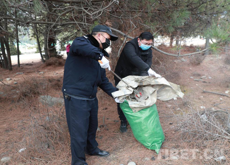 圖為林草局和森林公安職工清理山體垃圾
