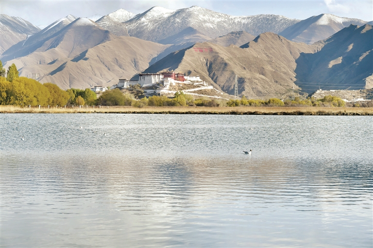 圖為拉魯濕地及遠(yuǎn)處的布達(dá)拉宮。 新華社記者 覺 果攝