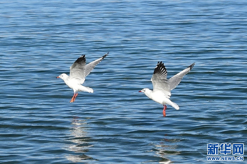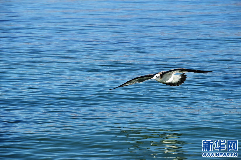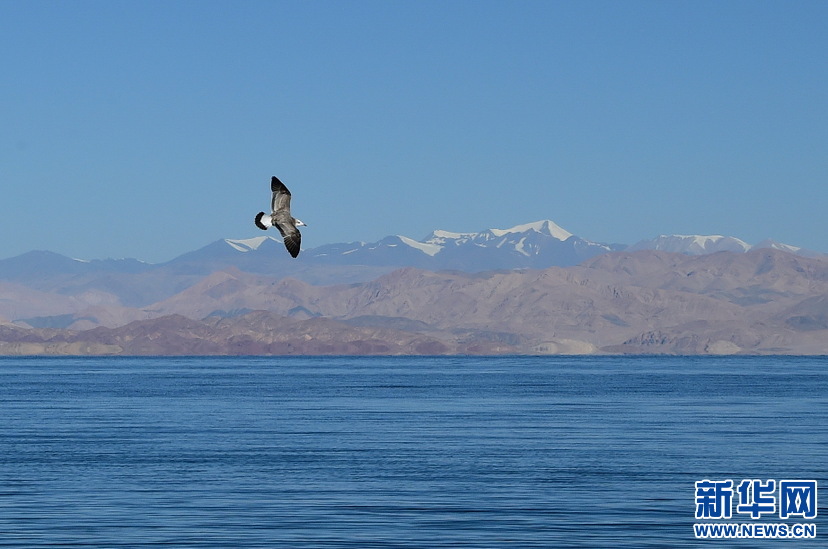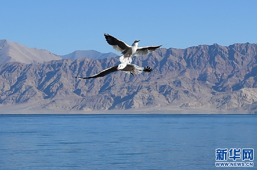 鳥兒在班公湖上空翱翔(10月19日攝)。新華網 張宸攝