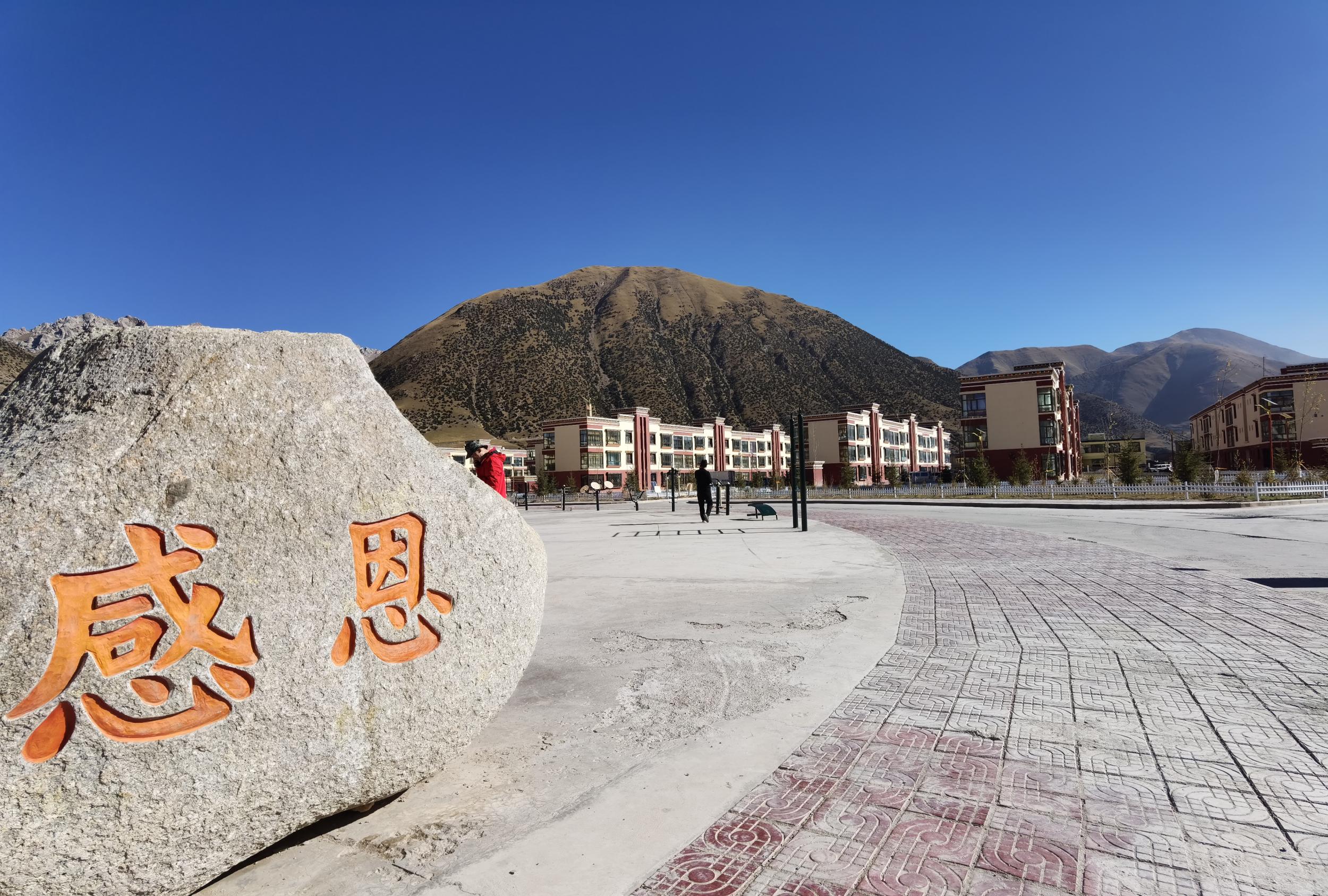 “牧民希望家園”小區(qū)內(nèi)的一個石頭上,“感恩”兩個紅色大字格外顯眼