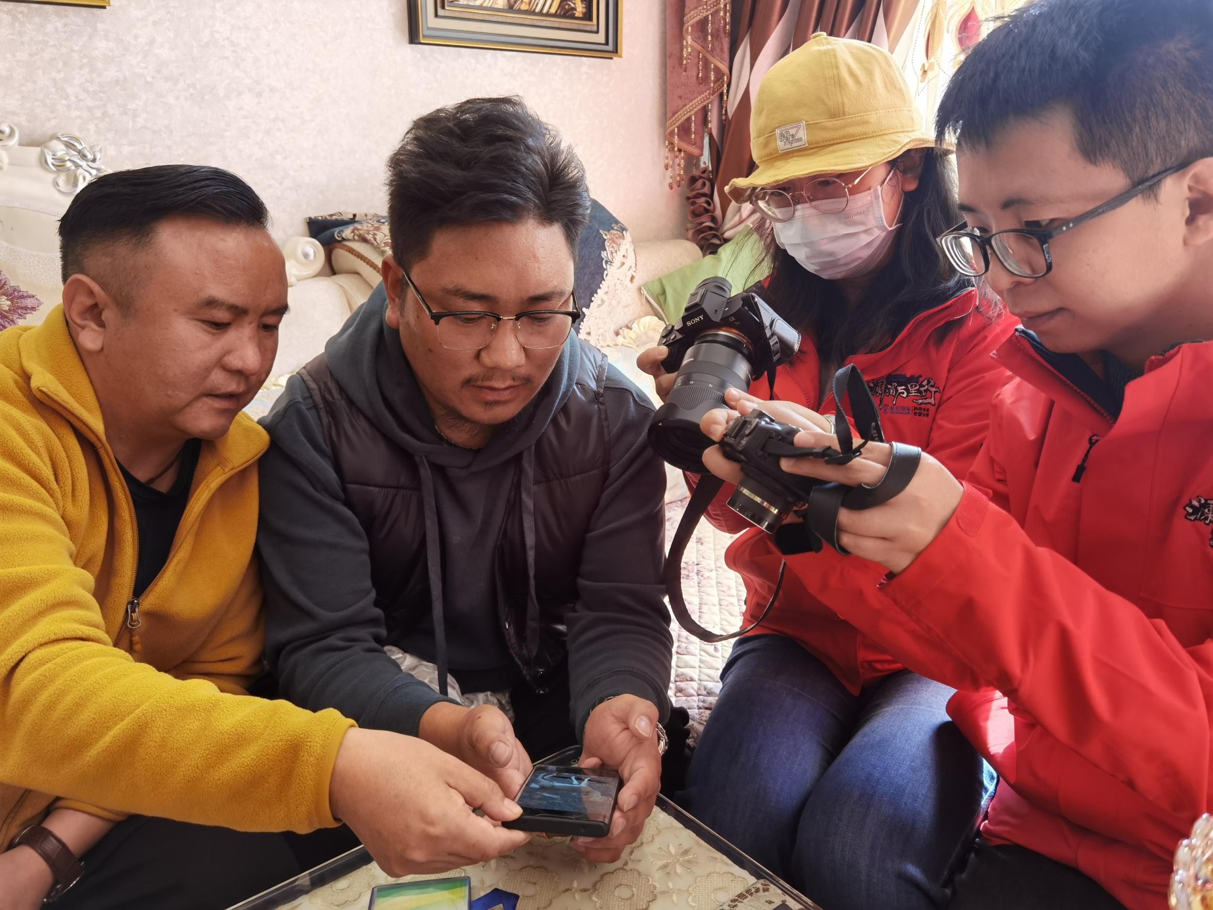 尕松義西(左二)給瀾湄萬里行中外記者翻看手機中野生動物的照片