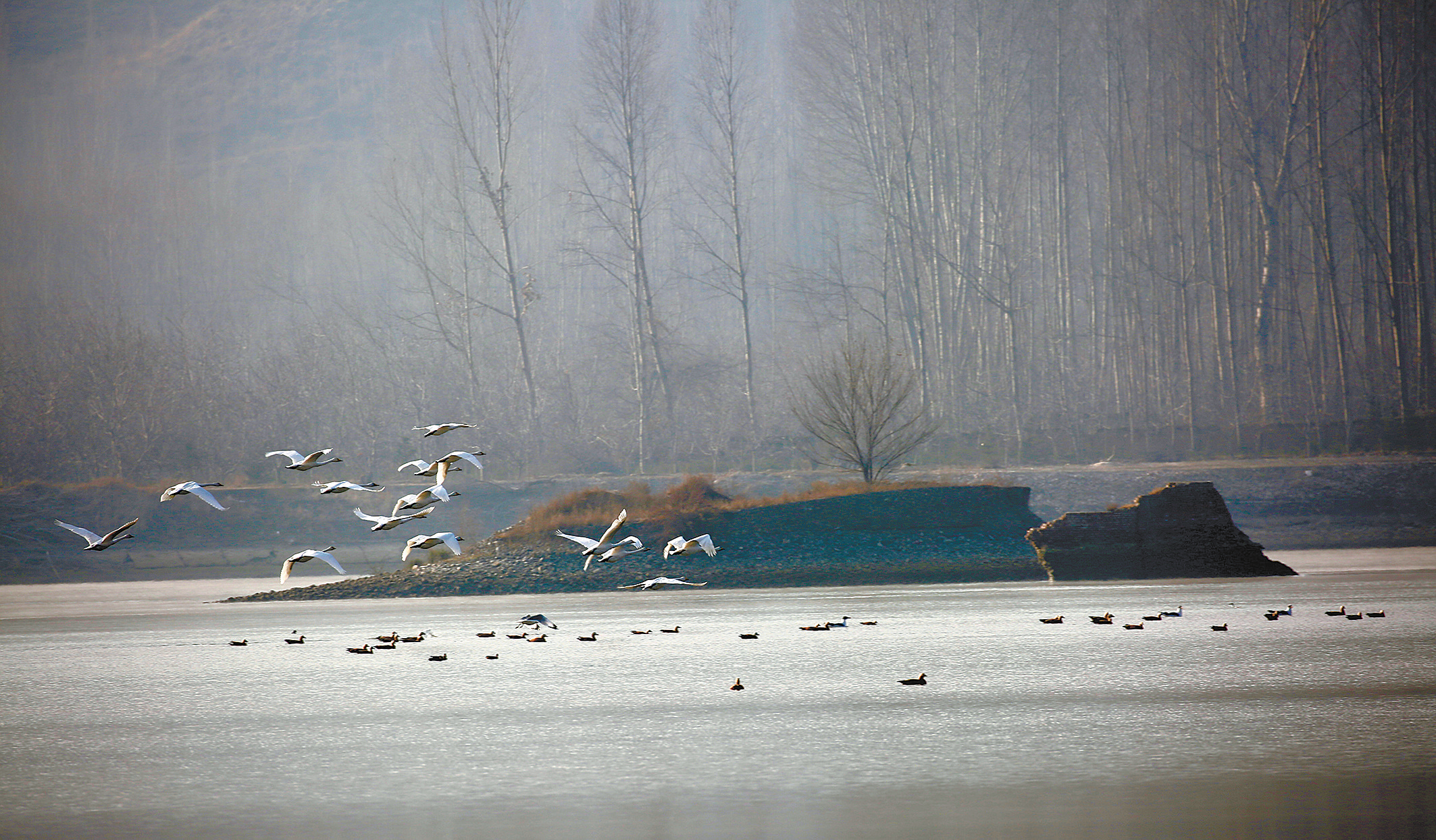 白天鵝學名叫大天鵝,屬國家二級保護動物,它們每年11月離開繁殖地遷往溫潤的南方過冬,遷徙時常成6-20多只的小群或族群遷徙,過去幾乎罕見在我們青海的黃河等水域棲息過冬。近年來,隨著三江源黃河水系生態(tài)環(huán)境的不斷改善,以往不曾見過的珍禽水鳥頻頻光顧黃河等水域安家落戶,這些水鳥中有白鷺、綠頭鴨、赤嘴潛鴨、白骨頂?shù)日淝荩噙_10余種,而白天鵝很少來“做客”棲息。