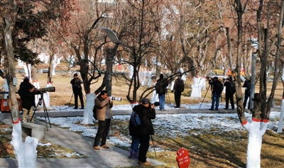 11月25日,記者來(lái)到海棠公園,從園方劉主任處了解到,太平鳥大約是一周前陸續(xù)來(lái)到海棠公園的,由最初的幾十只到現(xiàn)在的幾百只,甚至上千只,越聚越多。以前每年海棠公園也會(huì)有太平鳥光顧,但是沒(méi)有今年這么多。太平鳥每年來(lái)到海棠公園主要是來(lái)吃海棠果的,海棠公園500棵海棠樹,入冬后果實(shí)變得透紅,一串一串的紅果果,吸引了無(wú)數(shù)太平鳥到這里聚餐,成為海棠公園一道獨(dú)特的風(fēng)景。因每年這個(gè)時(shí)候都是太平鳥來(lái)海棠公園做客的時(shí)間,11月24日下午,海棠公園里早早的就聚集了二三十個(gè)等候的攝影師,其中有來(lái)自四川、甘肅、山西的,也有當(dāng)?shù)氐臄z影愛(ài)好者。他們扛著“長(zhǎng)槍短炮”不畏嚴(yán)寒蹲守著,全力以赴抓拍著太平鳥的美麗身姿。
