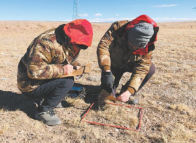 在另一塊平整的草地上,中科院西北高原生物研究所的賀福全和同伴正在采集植被樣本。賀福全說,他們的主要目標(biāo)是了解這個(gè)區(qū)域草的長勢(shì)情況,并將植被樣本帶回實(shí)驗(yàn)室進(jìn)行分析,針對(duì)這塊草地的承載能力,測(cè)量草地產(chǎn)量,給直升機(jī)和無人機(jī)做地面驗(yàn)證工作。