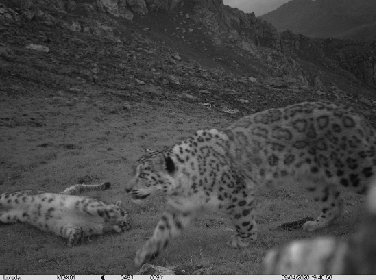 2020年10月5日,在祁連山東麓的青海省互助北山國(guó)家級(jí)森林公園首次拍攝到的雪豹“母子同樂”影像畫面。(資料照)