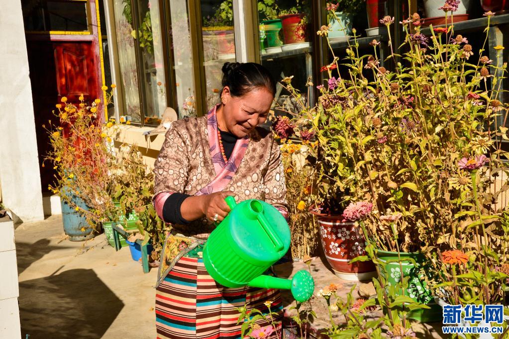 阿里地區(qū)札達縣札布讓村村民金珠德吉在院子里澆花。(2020年10月16日 攝 新華社記者 田金文 攝)