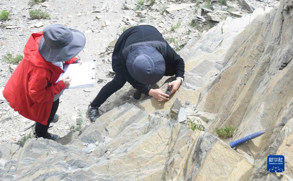 8月22日,在西藏日喀則市亞東縣一處山體,科考隊員使用羅盤,確定巖石的產(chǎn)出狀態(tài)和方位。新華社記者 杜剛 攝