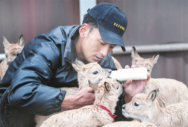 圖為可可西里國(guó)家級(jí)自然保護(hù)區(qū)卓乃湖保護(hù)站的工作人員才文多杰在給藏羚羊幼仔喂奶(2020年7月7日攝)。 新華社記者 薛玉斌攝