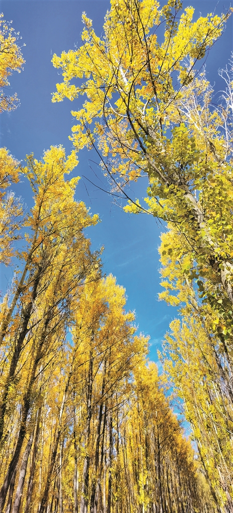 郊外的小樹林,澄澈的藍(lán)空和燦爛的黃葉相映成景。