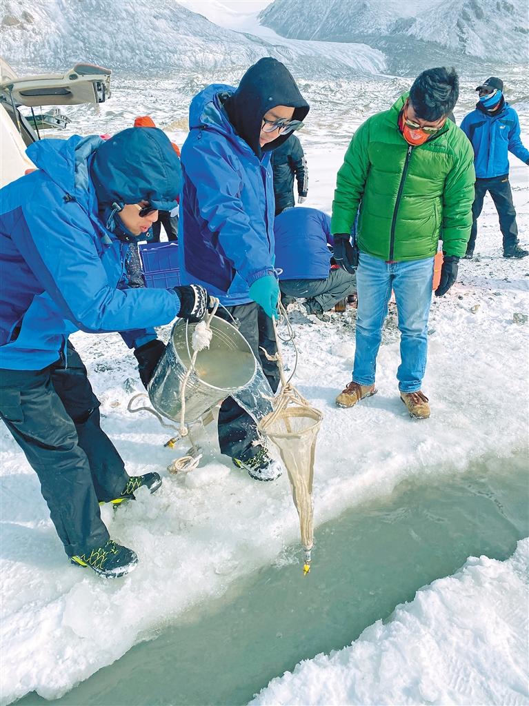 在姜根迪如冰川前的河道采取水生物樣本時,于愛琛要鑿開近10厘米的冰面,冰渣子進入收集網(wǎng)里,又要用手取出來。即使戴著手套,刺骨的水溫也能通過手指使寒意襲遍全身,他整個手臂如同電量快耗盡的機器,緩慢機械地進行著工作。但由于氣溫太低,沾了水的收集網(wǎng)很快又會被凍住,為了抓緊時間將樣本裝入瓶中,于愛琛索性取下手套,用開水將結(jié)冰的收集網(wǎng)融化,這一冷一熱間,整雙手早已麻木。當時,于愛琛整個臉都是發(fā)腫鐵青的,紫黑色的嘴唇完全爆皮,說話時血從嘴唇皸裂處流出也不自知。