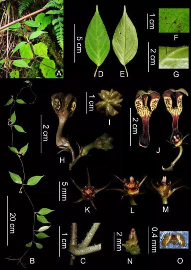 2021年7月中旬至8月初,由西雙版納植物園星耀武研究員率隊的聯(lián)合考察隊,對西藏日喀則地區(qū)喜馬拉雅南坡的維管植物進行了考察和標本采集。考察人員在吉隆縣薩勒鄉(xiāng)發(fā)現(xiàn)一種正處于盛花期的吊燈花屬未知植物。通過解剖拍照、文獻查閱及相似種的模式標本核對后,最終確認為一新種。根據(jù)其模式產(chǎn)地,將其命名為吉隆吊燈花(Ceropegia jilongensis)。