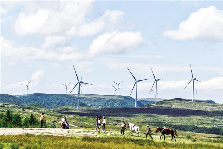 游客在貴州省龍里縣龍里大草原的風(fēng)電場觀光(2021年9月21日攝)。