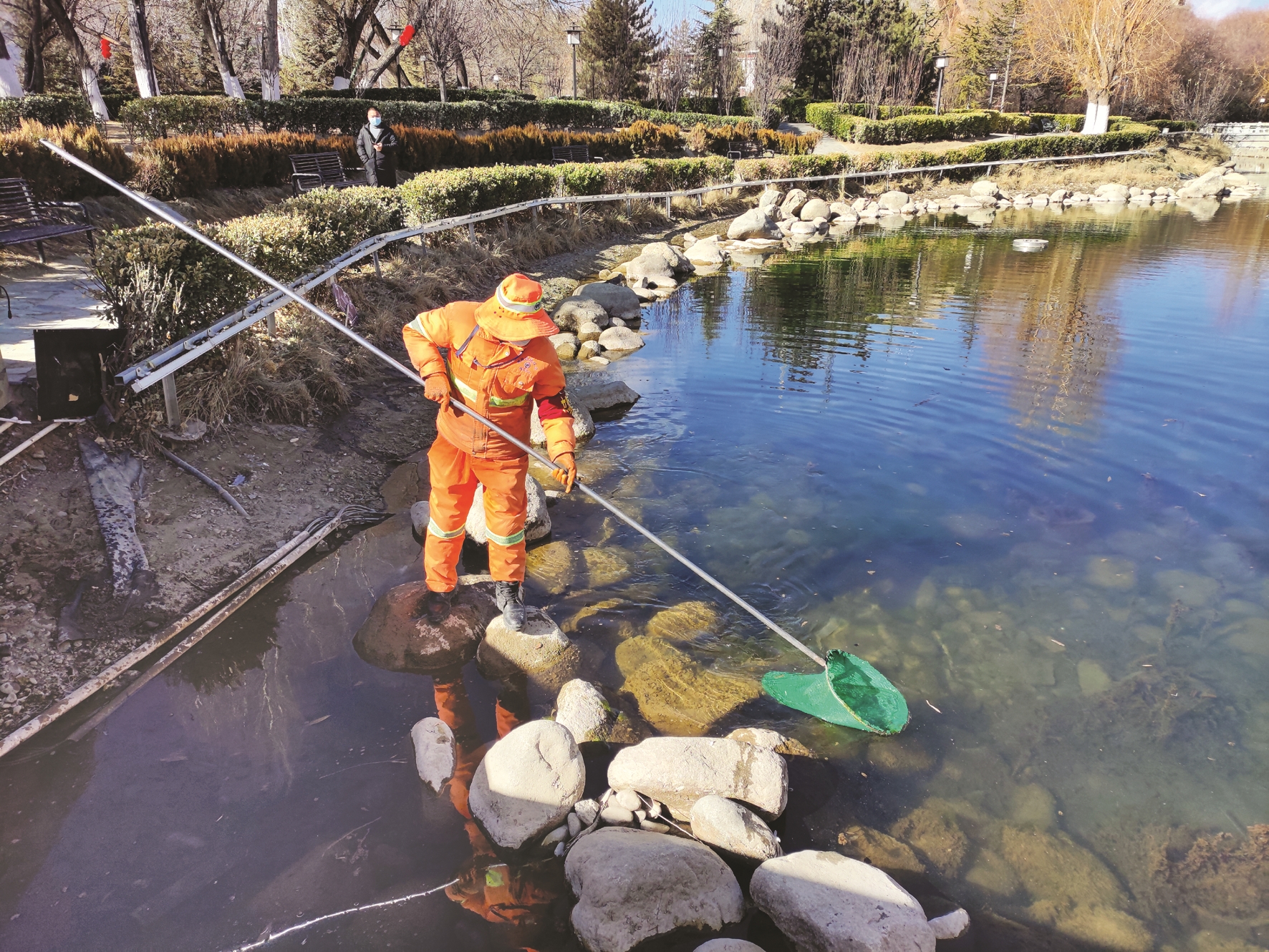 圖為布達拉宮廣場管理處工作人員手持長柄網(wǎng)兜打撈水里的垃圾。拉薩融媒記者 趙耀鐵攝
