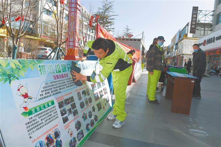3月14日,西藏各市地紛紛開(kāi)展春季愛(ài)國(guó)衛(wèi)生運(yùn)動(dòng),廣大黨員干部群眾走上街頭,參與城市環(huán)境衛(wèi)生清潔。這是拉薩市垃圾分類(lèi)宣傳活動(dòng)現(xiàn)場(chǎng)。 記者 旦增蘭澤 攝