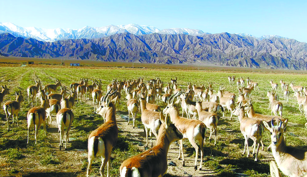 近日,200余只鵝喉羚集聚在海西蒙古族藏族自治州烏蘭縣呼德格勞牧場(chǎng)苜蓿草種植基地內(nèi),或悠閑吃草,或漫步在廣闊的牧野中,與背后的雪山構(gòu)成一幅人與自然和諧共處的美麗畫(huà)卷。