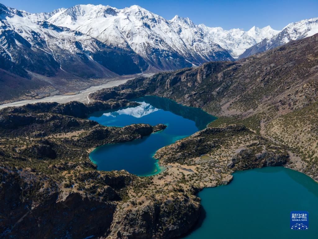 黑湖映射出雪山的倒影(4月2日攝,無(wú)人機(jī)照片)。新華社記者 周荻瀟 攝