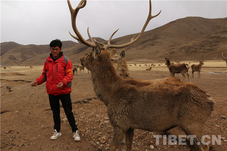 圖為一只調(diào)皮的馬鹿想要從仁青澤培手上偷吃芫根