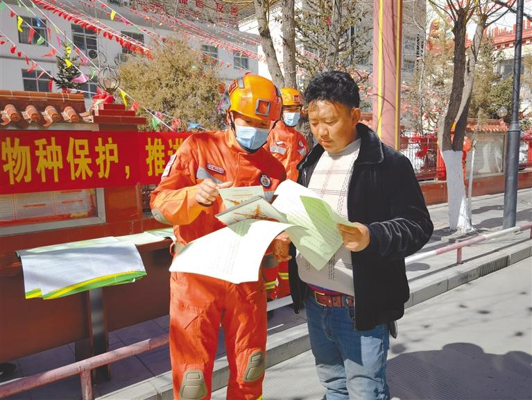 昌都市森林消防支隊(duì)邊壩縣駐防分隊(duì)隊(duì)員向群眾宣傳野生動(dòng)植物保護(hù)知識(shí)。記者 桑鄧旺姆 攝