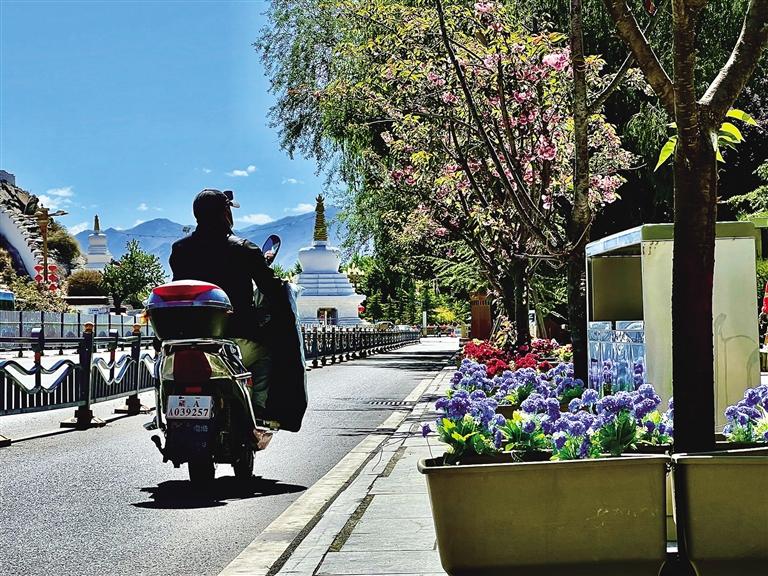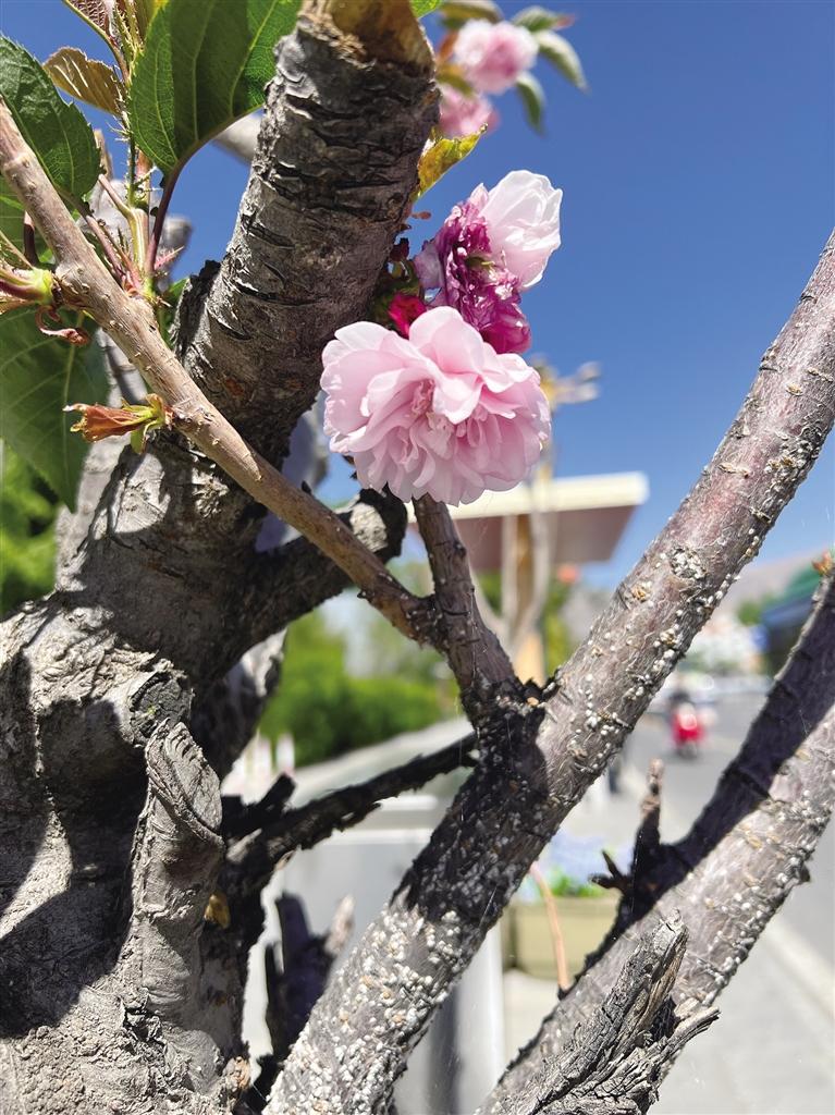 如今,走在市區(qū)街頭或公園,隨處可以看到開花的樹種,有的已經(jīng)凋零,有的開得正艷,有的含苞待放。在布達(dá)拉宮腳下的北京中路道路兩側(cè)櫻花全面盛開,粉紅色的櫻花宛如云霞,花瓣隨著微風(fēng)簌簌落下,煞是浪漫。將初夏的北京中路裝扮成一幅美麗的畫卷,吸引許多市民和游客賞花拍照。