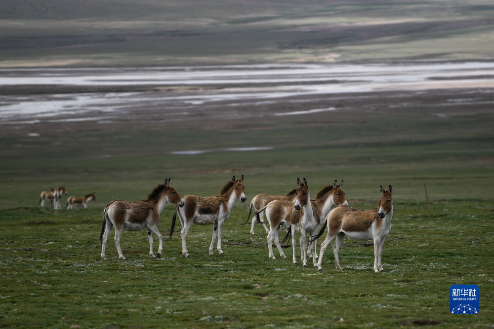 2021年7月25日,在三江源地區(qū),一群藏野驢在草原上活動(dòng)。新華社記者 張龍 攝