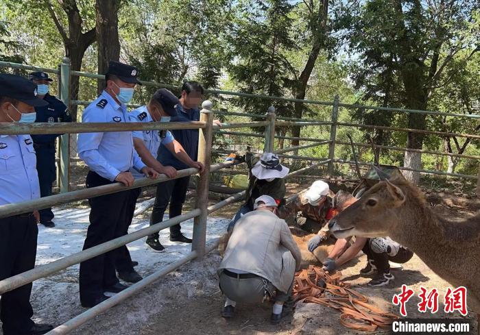 圖為青海省野生動(dòng)物救助中心工作人員對白唇鹿進(jìn)行檢查。 尖扎縣公安局供圖
