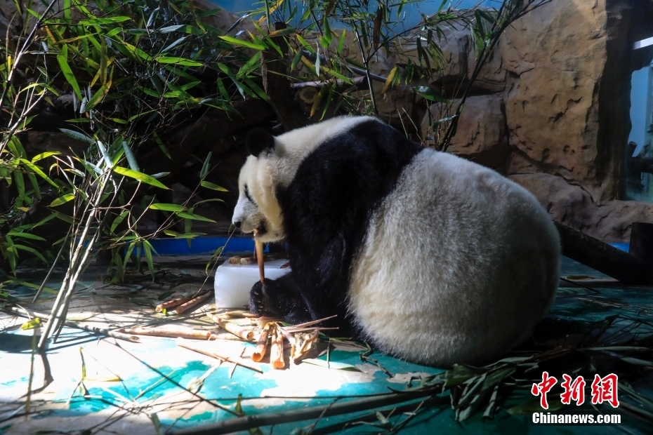 7月6日,四川成都動(dòng)物園,一只大熊貓?jiān)诒鶋K旁吃竹筍。當(dāng)日,成都市高溫天氣持續(xù)。 中新社記者 王磊 攝