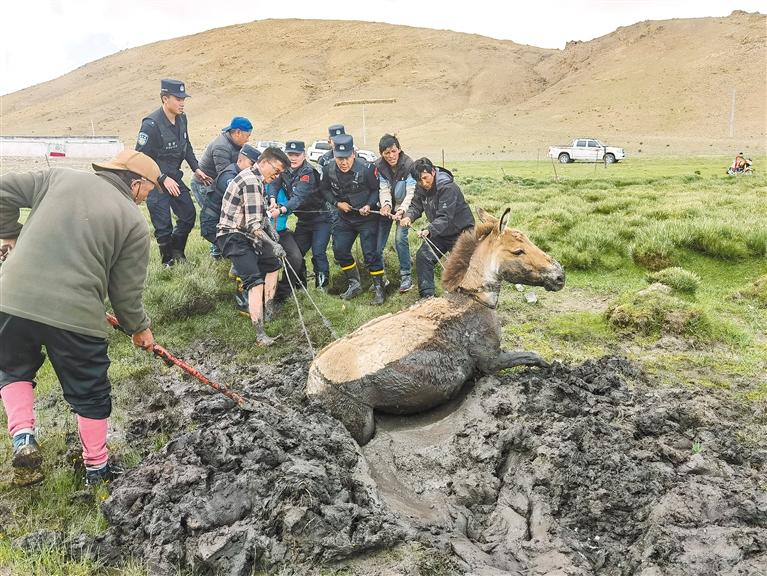 為避免藏野驢因驚嚇而發(fā)生次生傷害或受傷,民警們和圍觀群眾用鐵鍬一點點將周邊的沼澤挖開,使藏野驢的身體完全裸露出泥潭之外,而后用繩分別系住藏野驢的前半身和后半身,一點點向外拖拽,經(jīng)過近2小時的救助,警民合力將藏野驢成功從沼澤地救出。藏野驢因身體虛弱,休息片刻后才自然起立,歡快地回歸到生活的種群中,民警和救助群眾雖然累得氣喘吁吁,渾身大汗,卻由衷地為藏野驢的平安回歸而露出了喜悅的微笑。