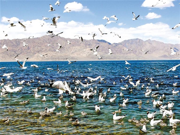 圖為水鳥嬉戲的班公湖。記者 洛桑旦增 攝