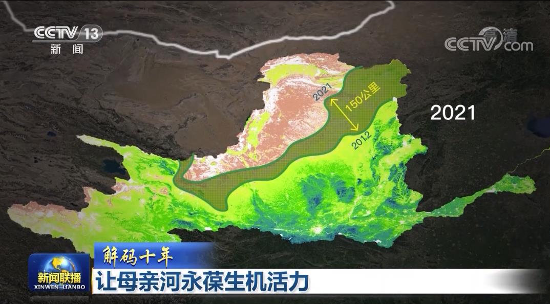 這是衛(wèi)星視角拍攝到的黃河,研究人員連續(xù)數(shù)年監(jiān)測(cè),結(jié)合大數(shù)據(jù)還原了黃河沿岸的生態(tài)狀況??梢郧逦乜吹?,十年間綠進(jìn)沙退,這條黃河生態(tài)綠線最寬處向前推進(jìn)了約150公里。