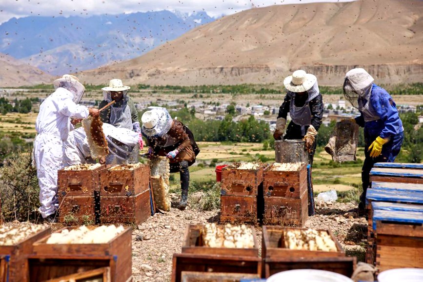 經(jīng)過幾年努力,來自貴州的養(yǎng)蜂人張亮富在山南市建起了一座蜜蜂文化主題生態(tài)體驗園,為當?shù)匕傩諑砹恕疤鹈邸?。今年,他與當?shù)?個縣開展蜜蜂養(yǎng)殖合作,投放蜜蜂2100余箱,建成64個養(yǎng)蜂點,預計年產(chǎn)值3200萬元?!袄习傩赵诩揖涂梢酝瓿擅鄯漯B(yǎng)殖,更能安心守護家園?!睆埩粮徽f。
