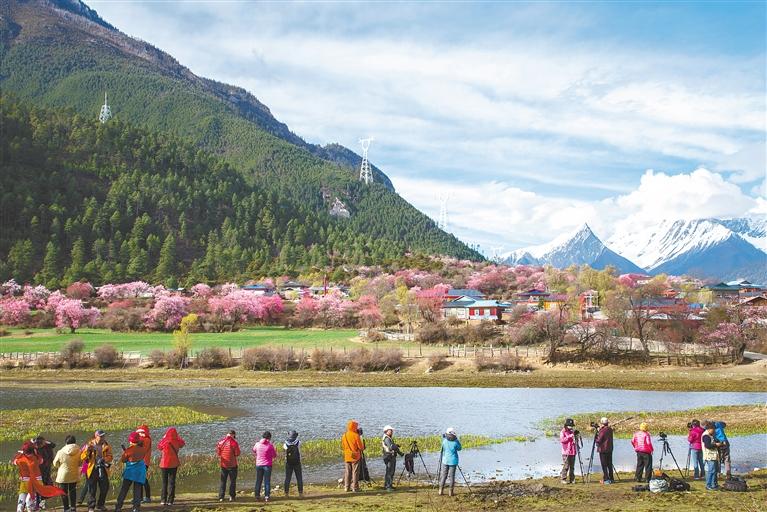 旅游業(yè)快速發(fā)展,全區(qū)旅游接待人數(shù)和旅游總收入分別由2012年的1058萬(wàn)人、126.47億元增加至2021年的4153萬(wàn)人、441.90億元。圖為2021年4月西藏自治區(qū)林芝市桃花節(jié)迎來國(guó)內(nèi)外游客。