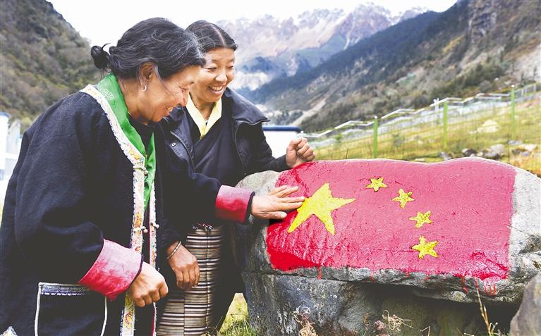 圖為“家是玉麥,國是中國”,人人爭做神圣國土守護(hù)者、幸福家園建設(shè)者。圖為“七一勛章”獲得者卓嘎和同為“時代楷?!钡拿妹醚胱诘诌呇策墶?/p>