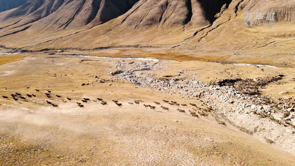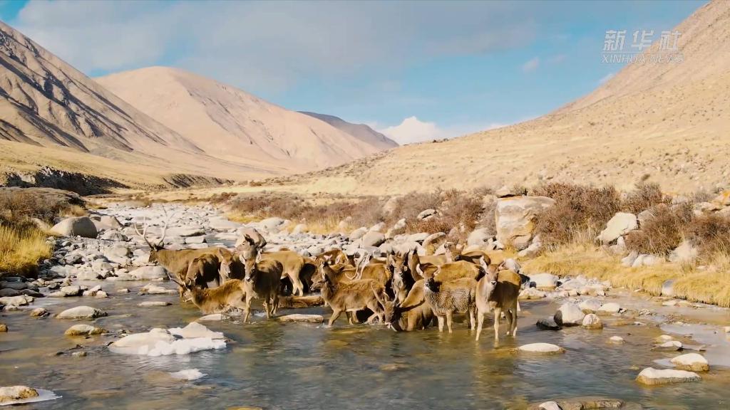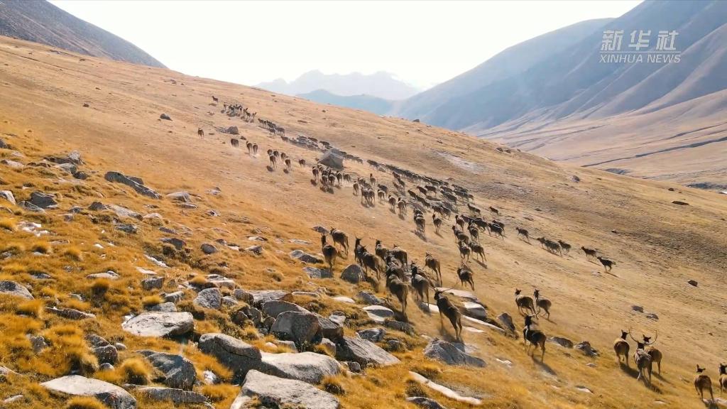 近日,在青海省海西蒙古族藏族自治州德令哈市柏樹山景區(qū),上百只白唇鹿現(xiàn)身山澗,奔跑嬉戲。
