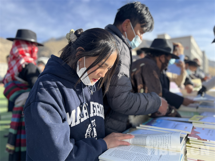 在送“書籍” 現(xiàn)場,《西藏文學(xué)》《西藏文藝》《邦錦梅朵》三個(gè)編輯部工作人員為現(xiàn)場群眾和當(dāng)?shù)馗刹抠?zèng)送書籍,當(dāng)?shù)厝罕姾蛯W(xué)生們紛紛前來翻看尋找自己喜歡的書籍,大家人手幾本書?!拔移綍r(shí)喜歡閱讀藏文文學(xué)作品,這次要了兩本文學(xué)相關(guān)書籍拿回家閱讀”17歲的益西巴珍說。據(jù)了解,此次活動(dòng)西藏文聯(lián)向熱愛閱讀的群眾和學(xué)生共贈(zèng)送1500本(冊)文藝書籍和期刊。