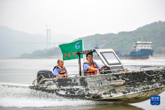 鴻鵠護魚志愿隊隊長劉鴻(右)帶領(lǐng)隊員在長江重慶江津段巡護(2022年9月2日攝)。新華社記者 黃偉 攝