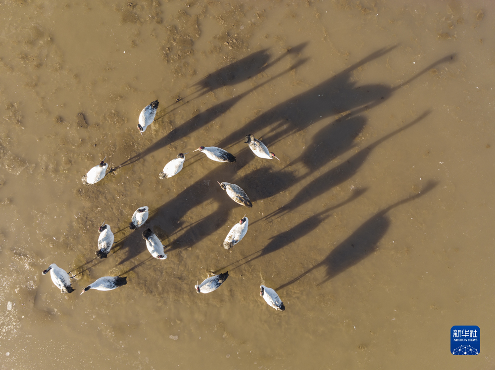 拉薩市林周縣卡孜水庫(kù)拍攝的黑頸鶴(3月1日攝,無(wú)人機(jī)照片)。新華社記者 孫非 攝