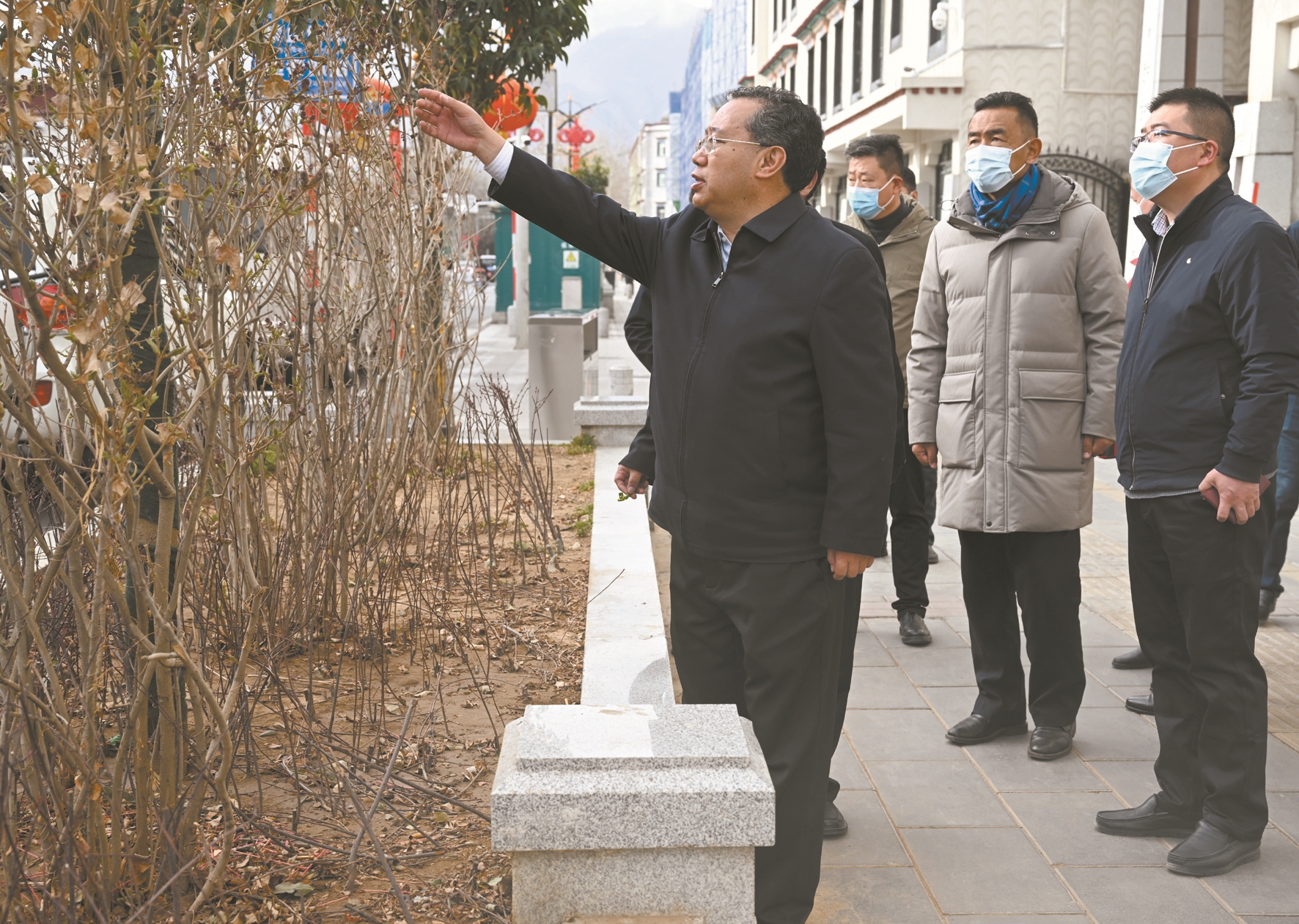 3月15日,西藏自治區(qū)黨委常委、市委書記普布頓珠帶隊深入城關(guān)區(qū),調(diào)研城市建設(shè)管理工作。圖為普布頓珠在朵森格路中段調(diào)研道路兩旁綠化帶植物缺損問題。拉薩融媒記者 巴桑次仁攝