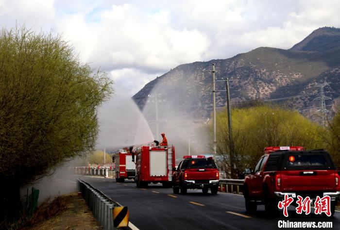 林芝市森林消防支隊消防員正在進(jìn)行灑水增濕作業(yè)?!∥骼@拉翁 攝