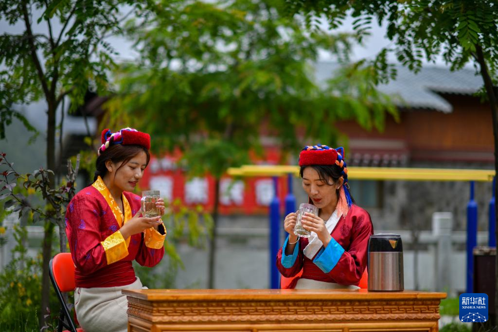尼瑪卓瑪(右)與村民一起品嘗新制成的莓茶(7月28日攝)。新華社記者 姜帆 攝