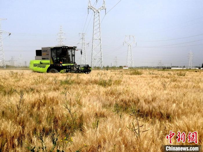 連日來,中國“鹽湖城”青海省格爾木市小麥進(jìn)入收割期。田野里,機聲隆隆,一臺臺聯(lián)合收割機穿梭麥田中,“吞”穗“吐”麥,一派豐收景象。