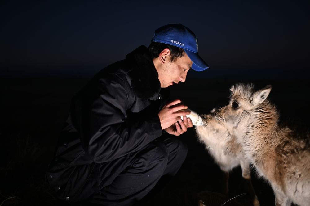 可可西里巡山隊員才文多杰在索南達杰保護站內(nèi)給被救助的藏羚羊幼仔喂奶(1月18日攝)。新華社記者 張宏祥 攝