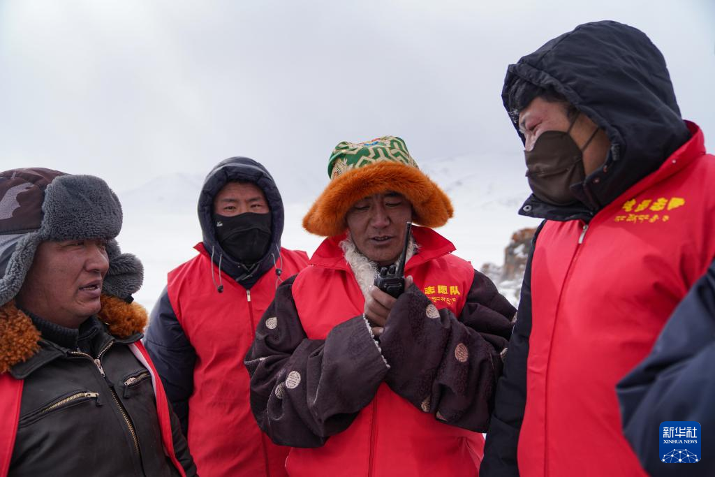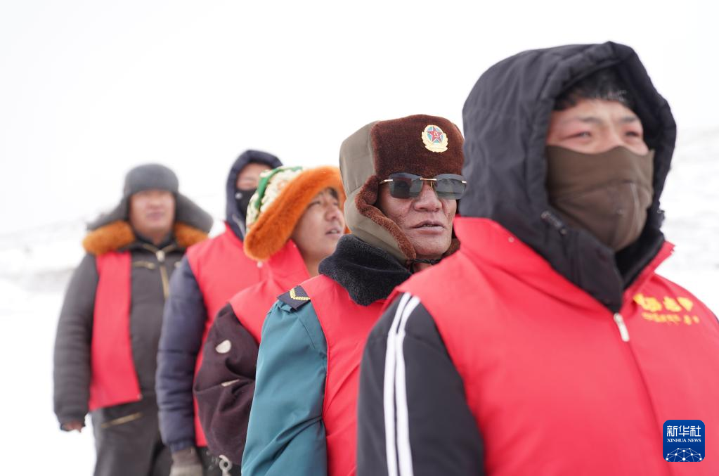 瑪曲鄉(xiāng)長江源黨員環(huán)保志愿隊年近七旬的才嘎老人(左二)在巡邏守護長江源(2024年2月2日攝)。新華社記者 晉美多吉 攝
