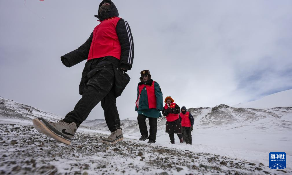 瑪曲鄉(xiāng)長江源黨員環(huán)保志愿隊年近七旬的才嘎老人(右二)在巡邏守護長江源(2024年2月2日攝)。新華社記者 晉美多吉 攝