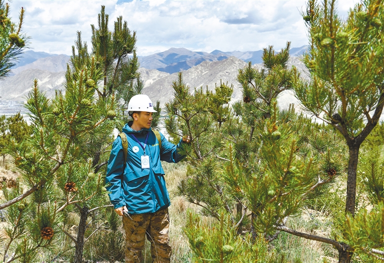 工程的綠意還延伸至拉薩貢嘎機(jī)場(chǎng)周邊的山體,山南市林草局林業(yè)和草原有害生物防治站檢疫員次仁羅布在造林現(xiàn)場(chǎng)進(jìn)行苗木復(fù)檢工作,復(fù)檢結(jié)果顯示這批苗木的成活率達(dá)到92%?!斑@里是走出貢嘎機(jī)場(chǎng)的第一站,旅客們可以直接看到我們種下的綠色,很有意義。”次仁羅布說(shuō)。