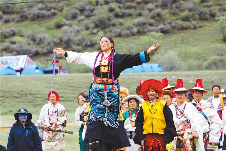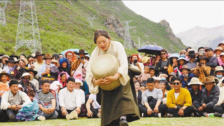 開幕式在藏雄村幼兒園小朋友表演的舞蹈《第一支花》中拉開序幕,唐古鄉(xiāng)、阿朗鄉(xiāng)、旁多鄉(xiāng)對北部三鄉(xiāng)獨特的文化藝術(shù)、生態(tài)環(huán)境以及豐富的“非遺”文化進(jìn)行展示與推介,還有特色服飾展演,他們將秀場搬到大自然,以“傳統(tǒng)民族服飾走秀+‘非遺’文化展示+牧區(qū)生活用具展示”為核心,配以林周縣唐古鄉(xiāng)關(guān)于北部三鄉(xiāng)服飾的唱頌詞與鼓點相融合,為展演提供了獨特的音樂伴奏,展現(xiàn)了林周縣北部三鄉(xiāng)豐富的民族文化。